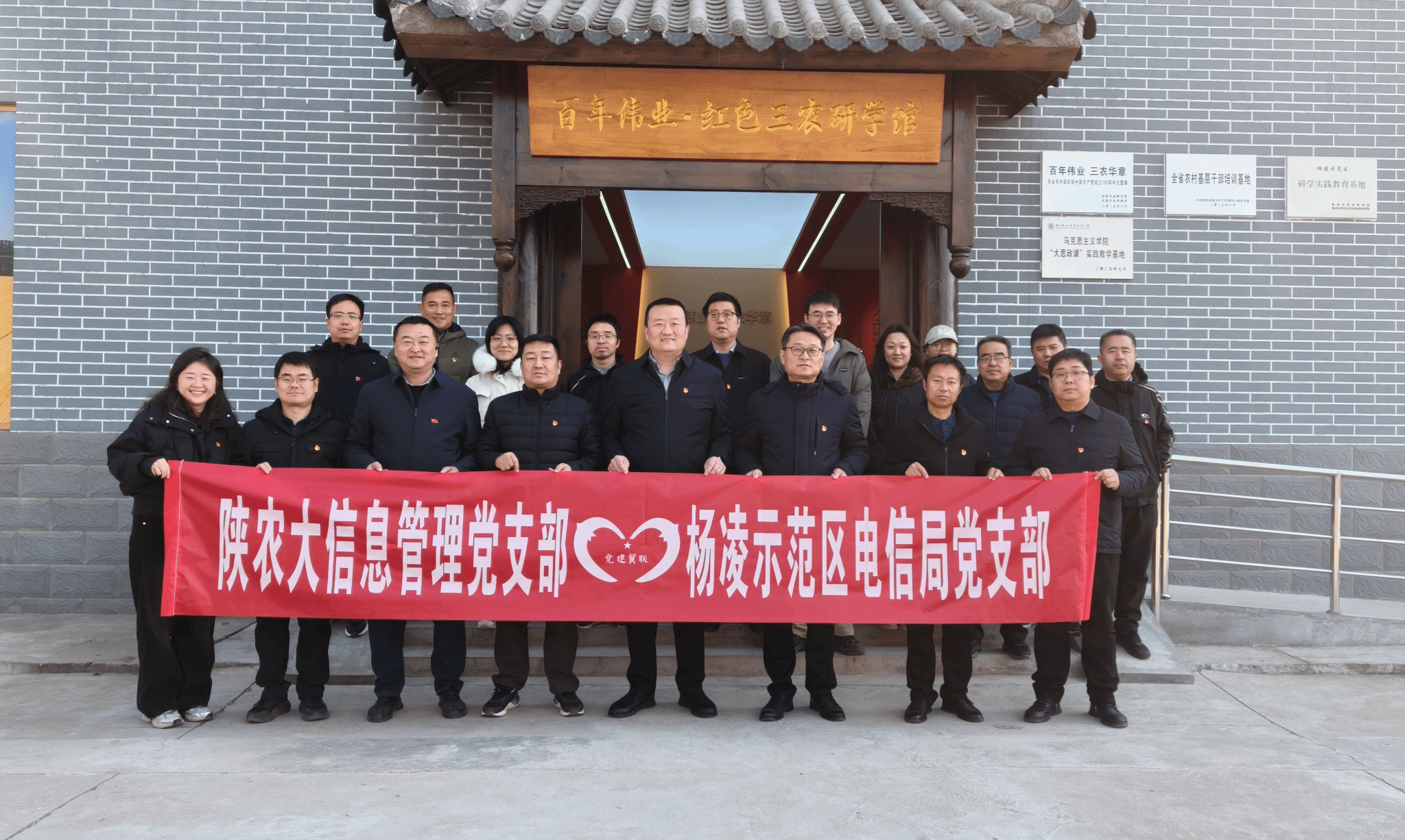 为深入学习贯彻党的二十届四中全会精神,推动习近平新时代中国特色社会主义思想学习教育常态化长效化,落实“学思想、强党性、重实践、建新功”总要求,12月26日上午,陕西农林职业技术大学信息管理党支部与杨凌示范区电信局党支部携手开展主题支部活动,以实地研学的方式追溯红色根脉、感悟三农发展,凝聚校企协同奋进的强大合力。