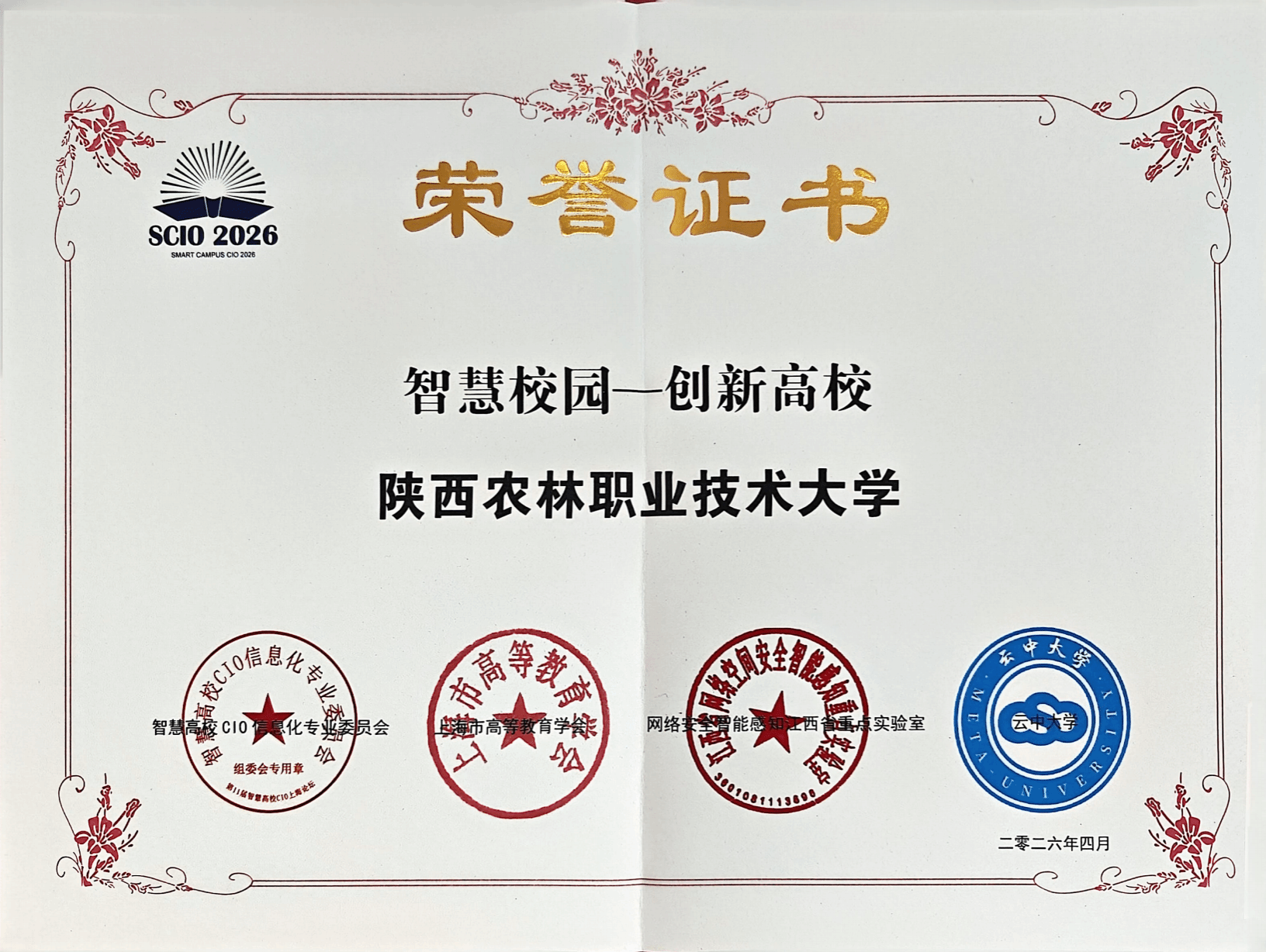 2026年4月10日,以“智启高等教育新征程”为主题的第十一届智慧高校CIO上海论坛在上海举行,我校凭借智慧校园建设的突出成效,斩获“智慧校园-创新高校”集体荣誉。